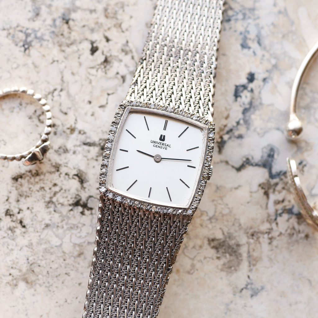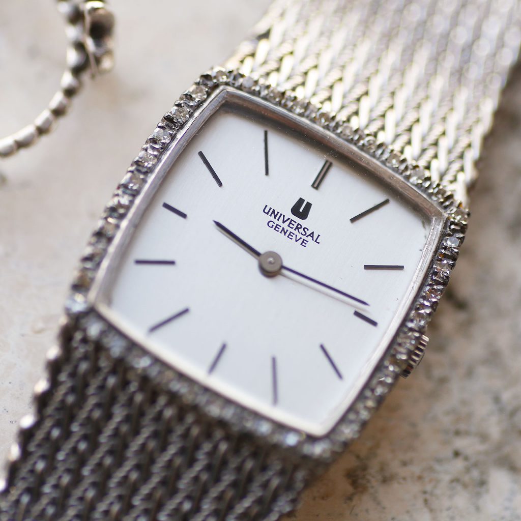 See Watch We present this absolutely stunning 1970s Universal Geneve diamond watch with intricate bracelet. Shop All In Stock