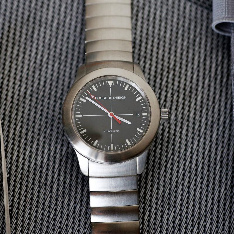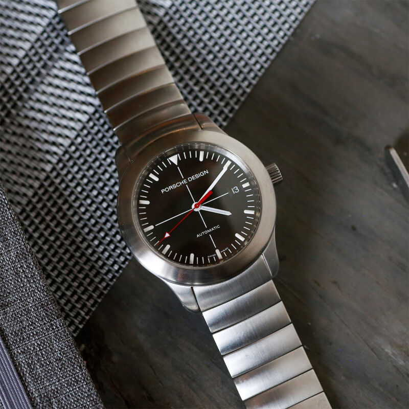 This late example 1990s Porsche Design P10 featues an automatic movement, a striking red second hand, and a desirable black cross-hair dial. Fully restored and ready for the race track. Store Overview In Stock