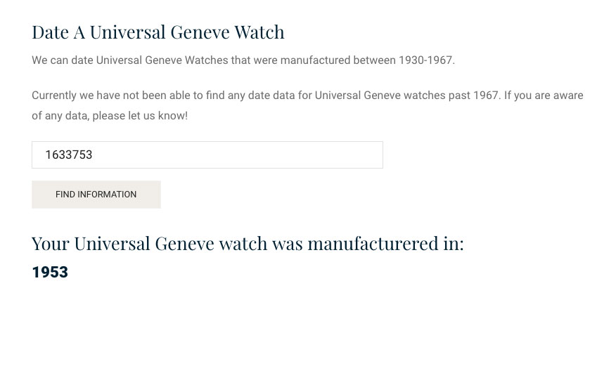 Woohoo!! So the Universal Geneve Uni-Compax example watch was manufactured in 1953. For this example our lookup tool was able to give a specific year. As mentioned earlier, if you watch happens to have been manufactured in 1967 or later, our lookup can only date your watch to 1967 at this time.