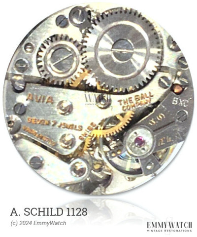The A Michel 454 watch movement is similar to the 27, 272, 274, 275, 277, and 2710 movements, with the only distinction being the varying bridge layouts. It features manual winding and a sub-second function. This movement was commonly used around 1955.