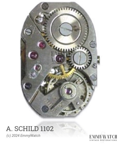 The A. Schild 1102 is a mechanical watch movement that features a indirectly driven minute mechanism, allowing for a larger balance and a low profile. It is a manual wind movement that includes functions such as sweep seconds, day and date display, and a quickset date that can be adjusted by repeatedly pushing the crown. This movement was commonly used between the late 1960s and early 1970s.