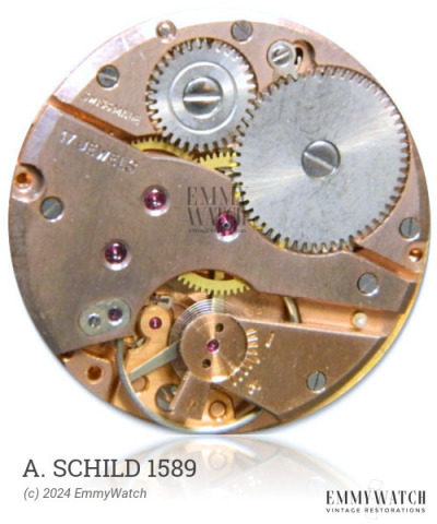 The A. Schild 1589 movement is a manual-wind mechanical watch movement that includes a sub-second function. It is part of a series of movements that include the 170, 173, 175, 176, 178, 179, and 180, although the specific differences between these movements are not known. The A. Schild 1589 movement was most likely used during the period of around 1945.