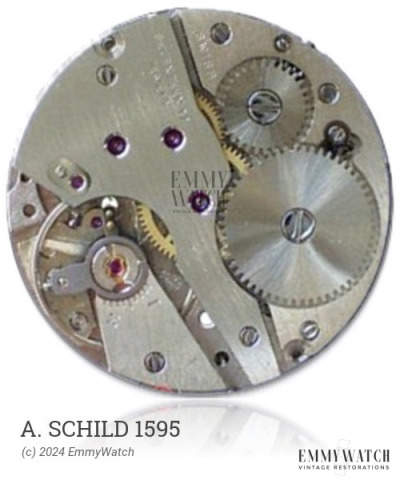 The A. Schild 1595 is an open face calibre movement featuring a Breguet hairspring. It is a stem-wind chronograph rattrapante with 60-second and 30-minute counters, controlled by a pillar wheel. The movement also includes a split second function activated by a crown pusher, as well as a sub-second display. The A. Schild 1595 was commonly used around the 1930s.