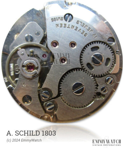 The A. Schild 1803 watch movement is a manual-winding movement that features a sweep second function. This movement was used during the period from 1963 to 1969.