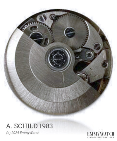 The A. Schild 1983 is a detached manual wind watch movement that was introduced in 1956. It underwent minor modifications during its production period. This movement features functions such as automatic winding, sweep seconds, and Incabloc Shock Protection.