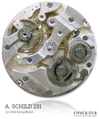 The A. Schild 231 is a mechanical watch movement with manual wind functionality and an incorporated sub second feature. It was primarily used during the 1945 timeframe.