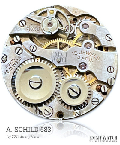 The A. Schild 583 watch movement, introduced around 1930, features a bimetallic screw balance, Breguet hairspring, and a balance barrel and stem sourced from Doxa. It performs manual winding and includes a sub-second function.
