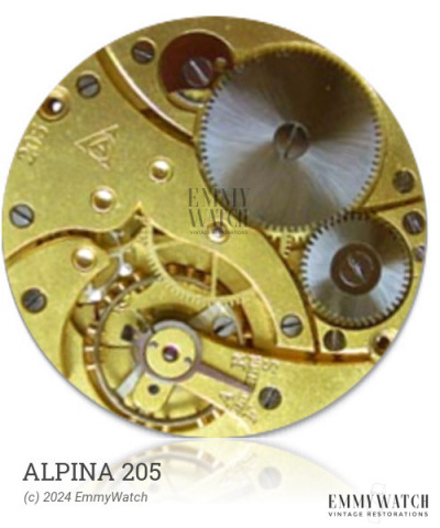 The Alpina 205 is a manual wind mechanical watch movement used in timepieces approximately from 1955. It features a Breguet hairspring and a regulator with a catch device for the hairspring. Additionally, it includes a sweep second function.