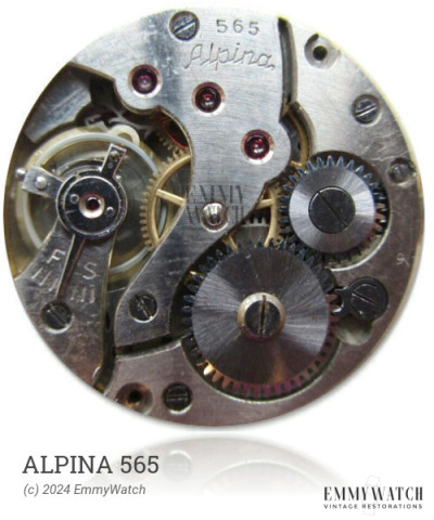 The Alpina 565 is a manual wind mechanical watch movement with sweep seconds and Incabloc shock protection. It was in use around 1955.