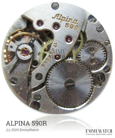 The Alpina 590R watch movement is nearly equivalent to the family Movado 45 through 48. It features a manual wind system and is equipped with KIF Shock Protection. This movement was in use around 1965.