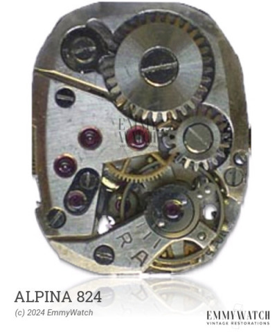 The Alpina 824 watch movement is a manual wind movement with a sweep second function. It features a bimetallic screw balance and belongs to a group of movements that include the 88, 89, 136, 138, 285, and 327, although the specific differences between them are not known. The Alpina 824 movement is estimated to have been in use around 1935.