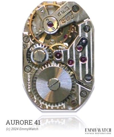 The Aurore 41 watch movement is a manual wind mechanical movement with a sub-second function. It features a ratchet on the dial side and incorporates a crown mechanism with a rocker bar. While it is similar to the A. Schild 954 movement, the 1096 model incorporates a different mainspring. Notably, the specific differences between the 1062 and 1096 movements are not known. The Aurore 41 movement was commonly used around the year 1935.