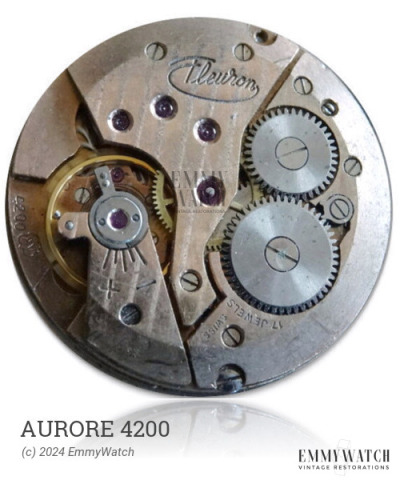 The Aurore 4200 is a manual wind mechanical watch movement that features sub seconds. It is part of a series of movements, including the 75, 78, 79, 83, 84, 88, 89, 94, 97, 98, 103, 105, 106, and 129. The distinguishing factor among these movements is believed to be the variation in bridge shapes, although specific differences are not known.