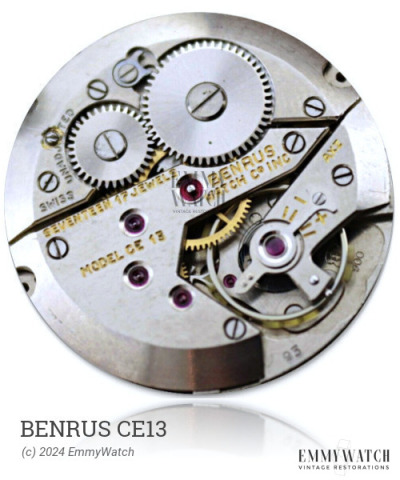 The Benrus CE13 is a manual wind watch movement that features a pin-lever escapement and an indirect minute hand friction clutch on the barrel. It was primarily used during the period around 1950 and includes functions like a sweep second hand.