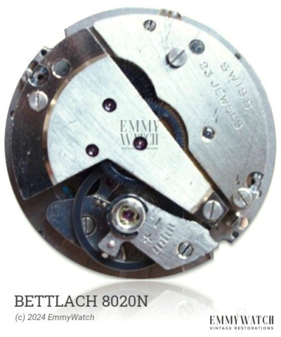 The Bettlach 8020N watch movement is a manual-wind movement with a sweep second hand. It features a stem mechanism without a setting-lever spring and incorporates Diafix combined settings for the escapement wheel. While the specific differences between the 66B, 436, and 4361 variations are not known, the movement includes shock protection and was used during the period around 1974.