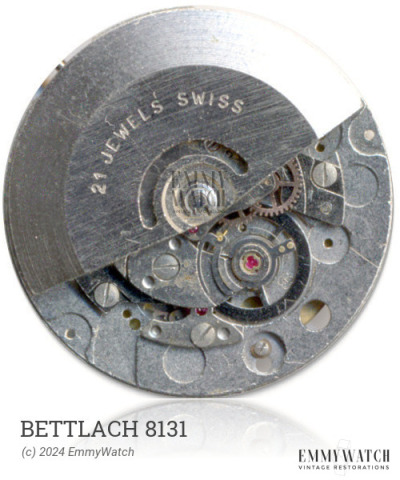 The Bettlach 8131 watch movement features 24 jewels, a minute wheel, and an automatic transmission wheel running on ruby studs. The movement incorporates an automatic function and a sweep seconds hand. Additionally, it includes a date function that can be set by changing the 20-24 hour position. The Bettlach 8131 movement was commonly used in watches during the approximately 1970 period.