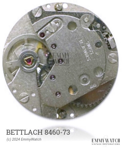 The Bettlach 8460-73 watch movement, manufactured around 1950, incorporates a pin-lever escapement and is equipped with a manual winding system. It features a sweep second hand and a date function. Notably, the movement includes a clever design element that replaces the setting-lever spring, yoke, and yoke spring with a single simple part. Additionally, the movement integrates an indirect minute hand friction clutch on the barrel.
