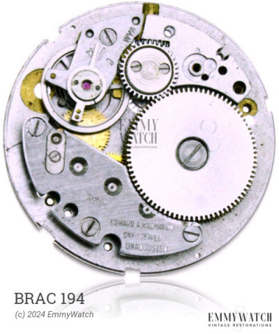 The Brac 194 is a mechanical watch movement that was produced in significant numbers between 1937 and 1970, with over 3.5 million units manufactured. It featured various chrono mechanisms and occasionally utilized interchangeable parts from different calibres, such as the larger pillar plate from the Landeron 51. The movement provides a range of functions, including a manual-wind chronograph with a 60-second recording capability, along with sub-second and 30/45-minute chronograph features.