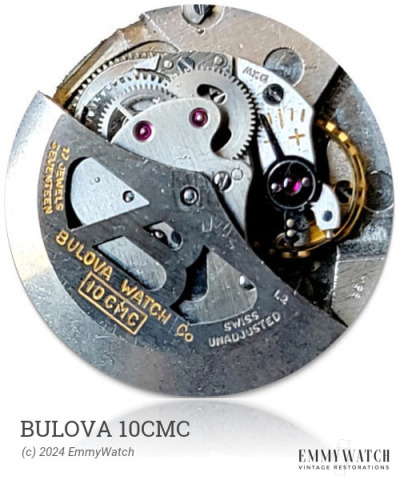 The Bulova 10CMC is a mechanical watch movement with a ball-bearing rotor. It is an automatic movement that features a sweep second hand, a quickset day display in two languages, and a quickset date display. The movement also includes an Adjustable Stud Holder and Shock Protection. Its period of use is approximately around 1968.