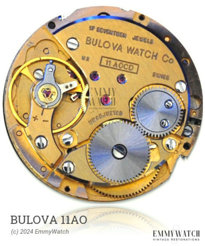 The Bulova 11AO watch movement is a manual wind mechanical movement with a sub-second function. It was utilized during the period of approximately 1938.