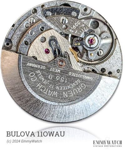 The Bulova 11OWAU watch movement is a detached manual wind movement that shares similarities with the 1361N, 1457N, and 1519 movements. It was commonly used in watches from approximately 1960. The movement's functions include automatic winding and a sweep second hand, although further details regarding these functions are not provided.