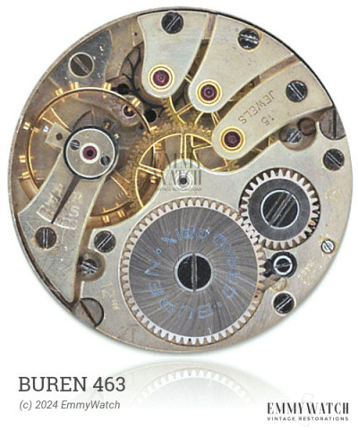 The Buren 463 watch movement is a manual wind movement that features a sub-second function, as well as day and date complications. The date can be set using the pusher located at the 2 o'clock position. The differences between the 1355N and the 1355 variant are not known at this time.