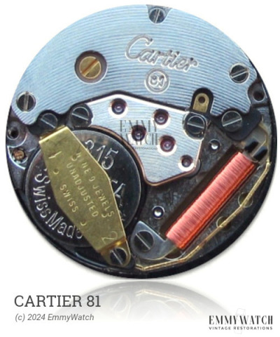 The Cartier 81 watch movement, manufactured from 1983 to 1985, features an ETA-ESA 555.411 movement without a sweep second hand and date function. It is a quartz-controlled stepper motor movement.