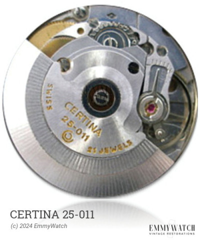 The Certina 25-011 is a watch movement that was used during the period from 1953 to 1955. It features a patented double-excenter winding system with jewelled rollers and a jewel-bearing rotor. The movement incorporates an intermediate wheel between the minute pinion and the rest of the train, enabling a large balance and low profile without compromising durability. This design also allows for the placement of the seconds wheel in either the center or for a sub-second, depending on the model, without requiring additional modifications. Early samples of the movement may have a hidden balance cock and may be partially or fully pink gold plated, while late samples feature a new rotor lock and ring balance. The movement functions include automatic winding and a sweep second hand.