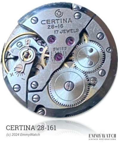 The Certina 28-161 watch movement features an open face calibre design with an early common spring that was later enhanced with separate springs for the operating lever and balance stop. Throughout its production period, various additional detail modifications were made. This movement includes a timer function with options for intervals of 60 seconds (accurate to 0.2 seconds) and 30 minutes, facilitated by a pillar wheel mechanism. Additionally, there is an option for intervals of 30 seconds (accurate to 0.1 seconds) and 15 minutes, as well as an option for intervals of 3 seconds (accurate to 0.01 seconds) and 90 minutes. The movement is stem wound and incorporates a sweep second hand and sub minute display.