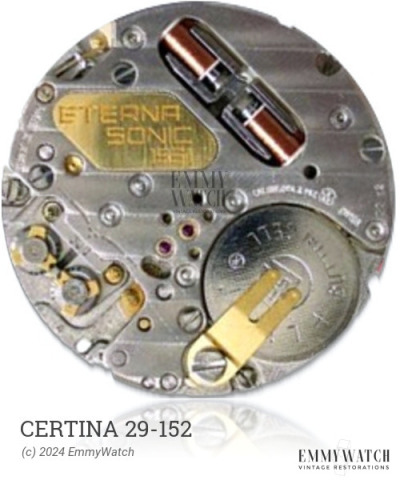 The Certina 29-152 watch movement is a first series-produced electronic movement from Junghans, manufactured during the period of 1967-1968. It features a ruby pin lever, an electronically controlled balance motor, a sweep second function, and a hack feature.