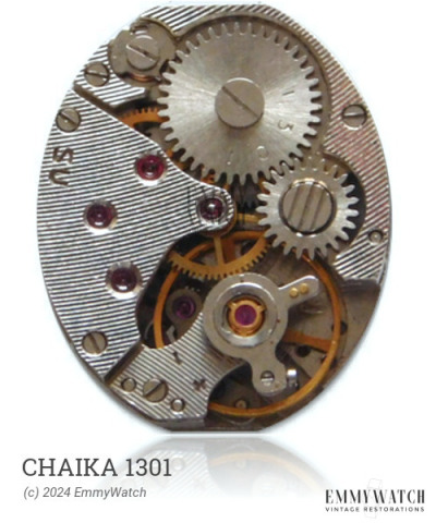 The Chaika 1301 is a mechanical watch movement characterized by its larger pillar plate compared to the 28-2. Its features include manual winding, sweep seconds, and a date complication. The movement also incorporates a calendar function. The Chaika 1301 movement was commonly used during the period around 1955.