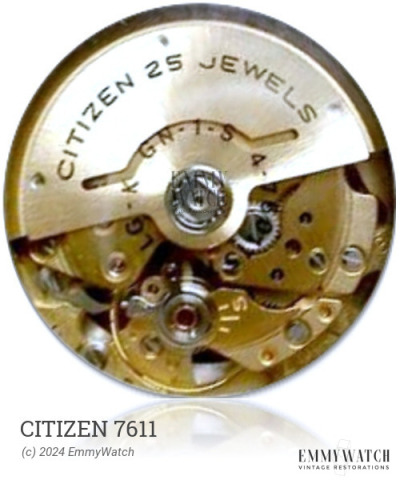 The Citizen 7611 watch movement is an automatic mechanical movement with a sweep second hand and day and date display. It features a high-quality balance that allows for a large balance wheel and a low profile. The date can be quickly set by repeatedly pushing the crown. This movement was commonly used in watches around the period of 1960.