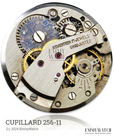 The Cupillard 256-11 watch movement was produced from 1899 to 1902, with a total of 11,000 units manufactured. It features a hunter calibre design, specifically model 2. The movement is equipped with a bimetallic screw balance and a Breguet hairspring. It incorporates a negative stem mechanism, allowing for stem winding and setting. The movement also includes a sub second function.