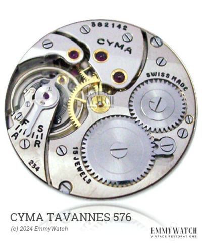The Cyma Tavannes 576 watch movement, likely designed by Record around 1970 and also applied by Longines, features a manual wind function, sweep second, adjustable stud holder, KIF shock protection, and sweep seconds. Its unique design places the minute wheel and pinion under the balance, allowing for a relatively large balance. Limited data and documentation are available for this movement line, with only Boley and Flume providing partial information. The movement shares the same staffs and stems with Longines, according to Boley's specifications. This movement is not commonly found in older movement registers.