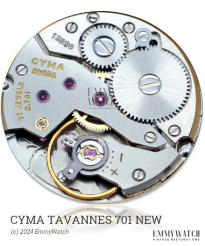 The Cyma Tavannes 701 NEW is a manual wind mechanical watch movement that features a sweep second hand and a date function. The date can be set by adjusting the time to the 21:15-24h range. This movement was commonly used around the 1960s.