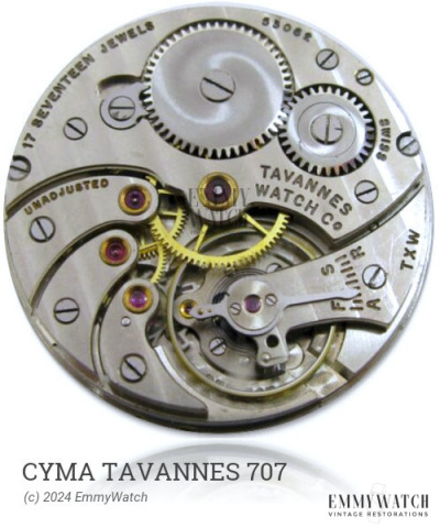 The Cyma Tavannes 707 is a manual wind mechanical watch movement with a sub second function. It was predominantly used in watches produced around the year 1945.