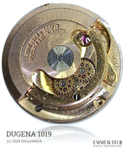 The Dugena 1019 watch movement was produced during the years 1970-1974 in limited quantities. It features an AS2 lever regulator and was originally developed for the ASSA Chronospeed 1920 chromometer, but was also adopted by a few other companies. This movement incorporates various functions, including automatic winding, sweep seconds, a day display, and a quickset date feature achieved by repeatedly pushing the crown. Additionally, it includes a stop seconds function and a day-date display. The Dugena 1019 movement was utilized during the period from 1970 to 1974.