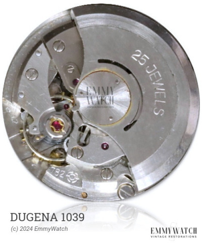 The Dugena 1039 is an automatic watch movement that was in use from 1957 to 1962. It was the first movement family to feature a micro rotor for self-winding. The self-winding gear incorporates a pinion positioned between two large jewels for switching directions. In the 17-jewel variations, one of these jewels is replaced by a polished steel disc. The movement includes functions such as sweep seconds and Incabloc shock protection, but no further elaboration is provided.