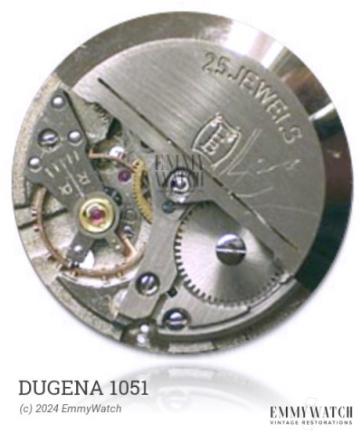 The Dugena 1051 watch movement is a mechanical movement utilized in wristwatches. It shares similarities with the Lemania 4651 watch movement, although specific differences are not known. The movement features an automatic winding mechanism, allowing the watch to self-wind. It also includes a sweep seconds hand, which moves continuously rather than ticking in increments. The Dugena 1051 movement was primarily used in watches produced around 1955.