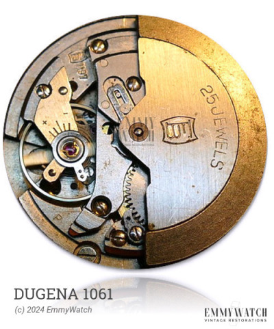 The Dugena 1061 is a manual wind watch movement, belonging to the detached type. It is highly similar to the A. Schild 1424N, with no notable differences known between the two. The movement, utilized around the 1950s period, features automatic winding, a sweep seconds function, and a power reserve display lasting approximately 36 hours.