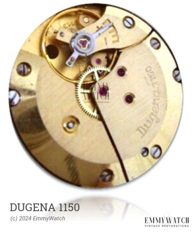 The Dugena 1150 is a mechanical watch movement with various bridge layouts. It features manual winding, sweep seconds, and was used during the approximate period of 1945.