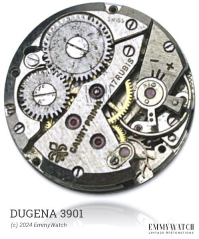 The Dugena 3901 is a manual-wind chronograph movement with a cam switched mechanism. It offers a variety of functions including a 60-second and 30-minute chronograph, a 12-hour counter, and a sub-second display. The movement also features a 24-hour display, a quickset date hand, and a month setting via the date mechanism. It includes a moon-phase display that can be easily adjusted and a hack feature. The Dugena 3901 was utilized in watches during the period from 1986 to 1998.