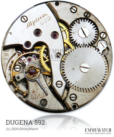 The Dugena 592 watch movement, a type of open face calibre, features an optional Breguet hairspring and varying bridge shapes. It is likely equipped with a left-handed ratchet-wheel screw and serves functions such as stem winding and setting, sub seconds display, regular and reverse winding. It was commonly used around 1920, and although differences between the Unitas 29 and 359 are not known, these numbers are believed to represent varying bridge designs catalogued for the movement.