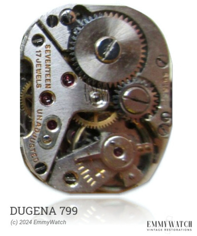 The Dugena 799 watch movement is closely related to the Aurore-Villeret 120, Bulova 6AH, FHF 120, and their variants. There are contradicting data regarding interchangeability in movement registers. Derivatives mentioned in multiple registers or those verified for equivalence are included in the list. The Bulova calibres exhibit design details absent in the FHF calibres, indicating the possibility of Aurore-Villeret origins. Notably, there is a lack of known differences between calibres 120 through 122, 122N, 124, 125, 127, 1220, and 1221. The Dugena 799 movement is a manual wind mechanism primarily used around 1943.