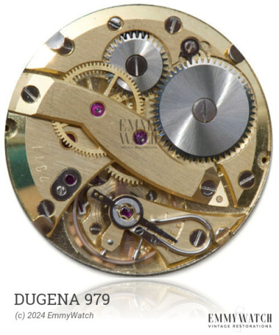 The Dugena 979 watch movement is a manual wind mechanism that was used during the period of 1935-1957. It features a bimetallic screw balance and utilizes a Breguet hairspring.