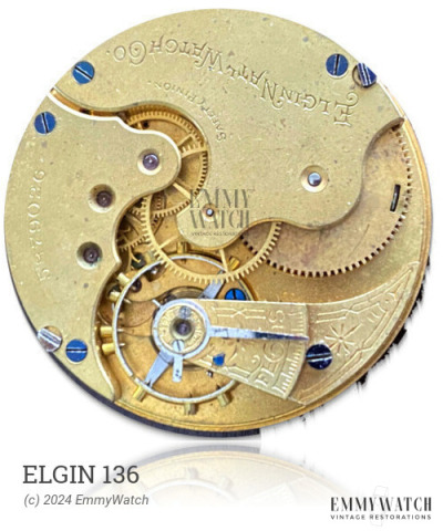 The Elgin 136 is a manual wind watch movement that features a sweep second function. It was primarily used during the period around 1960.