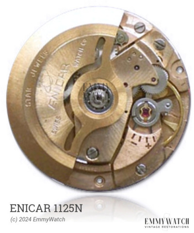 The Enicar 1125N watch movement is an automatic, jewel-bearing rotor movement with 23 jewels. It features a detached manual wind and an ingeniously simple power reserve display. The power reserve display is achieved by transferring the rotation of the barrel arbor to the hand, and the rotation of the barrel to a tiny dial, without the need for a complicated differential gear. Additionally, the movement includes sweep seconds and an automatic function. The power reserve display has a range of 2 to 38 hours, although it should be noted that this range actually covers a run time of only 34 hours, making the stated range slightly exaggerated.