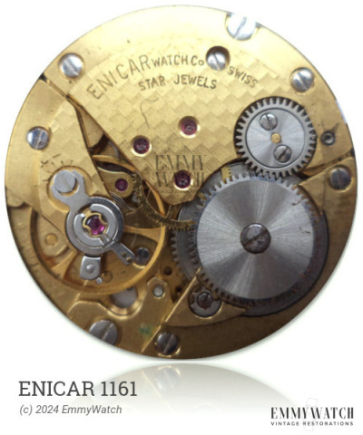 The Enicar 1161 watch movement features Kif-Duofix combined settings for the escapement wheel. This manual wind movement offers precise timekeeping and reliability.