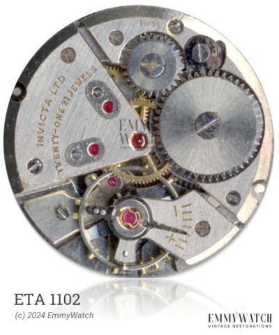 The ETA 1102 is a manual wind watch movement that features a big balance and low profile, thanks to its indirectly driven minute. Additionally, it incorporates sweep second and shock protection functions. The movement was primarily used in watches manufactured around 1970.