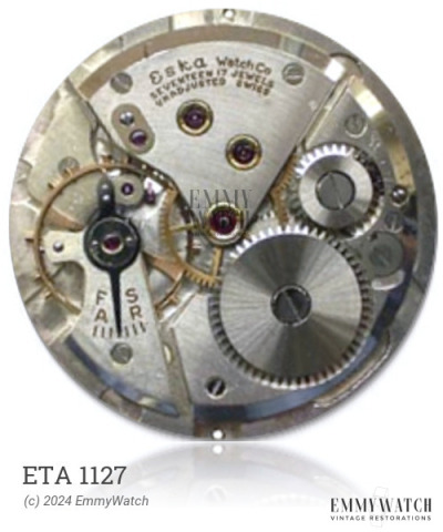The ETA 1127 watch movement is a mechanical movement that features a pin-lever escapement, a ratchet on the dial side, and a crown mechanism with a rocker bar. It is a manual wind movement with a sub-second function. The movement follows the pin lever design and was commonly used around the 1950s.